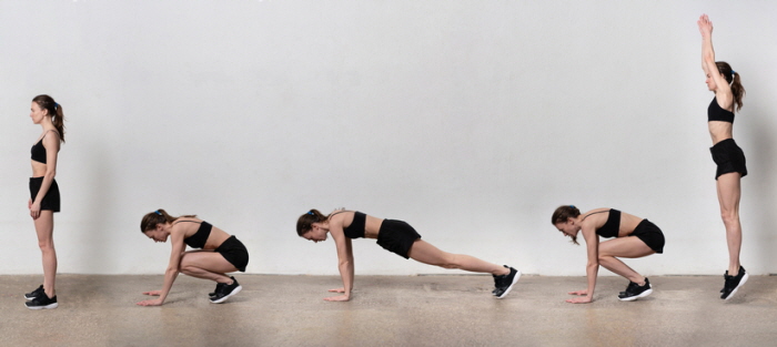 버피는 전신을 사용하는 유산소 운동으로, 빠른 속도로 운동할 수 있습니다. 아래의 동작을 따라 해 보세요: